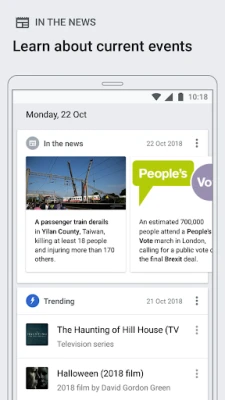 Explore feed: Recommended and constantly-updating Wikipedia content right on the home screen, including current events, trending articles, events on this day in history, suggested reading, and more. The feed is fully customizable — you can select the types of content you want to see, or rearrange the order in which different types of content appear.